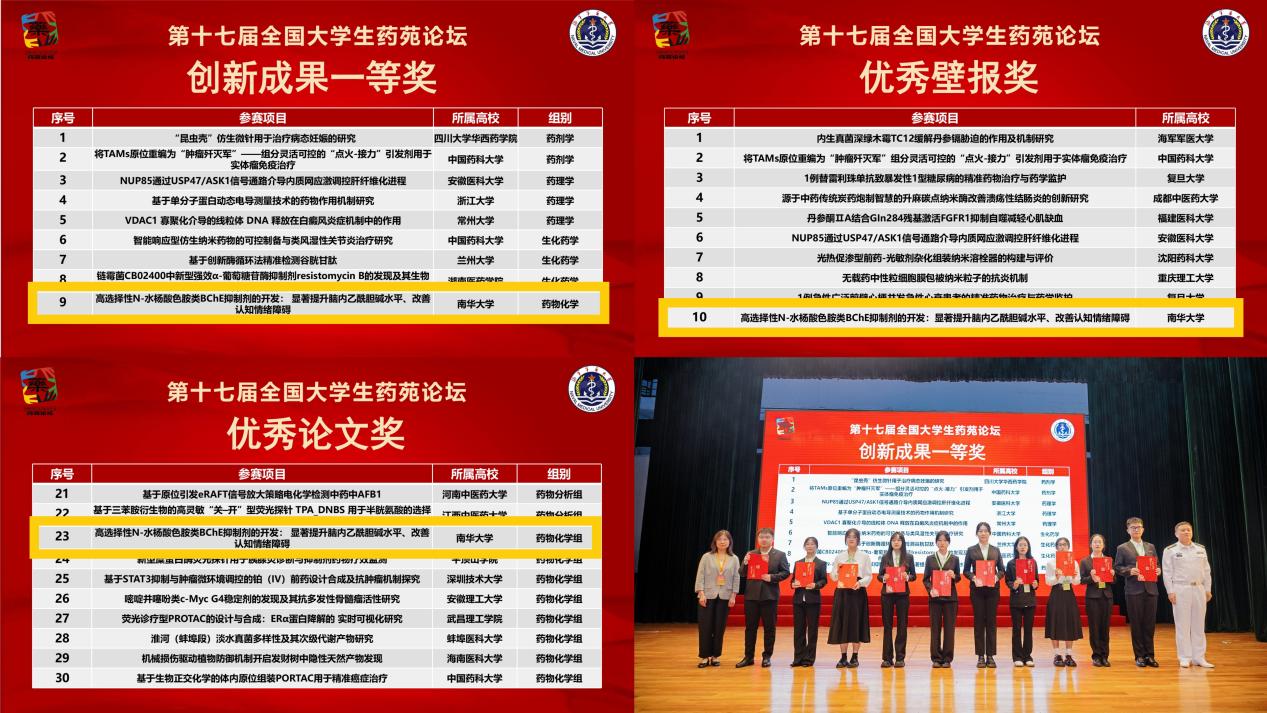 在刚刚落幕的第十七届“全国大学生药苑论坛”总决赛中,雷竞技中国 学子再创佳绩。在王震教授和彭雪博士的指导下,由曾羡麟、唐雅庭、李羿翰、巫清玲、向甜杏五位同学组成的参赛团队,凭借项目《高选择性N-水杨酸色胺类BChE抑制剂的开发:具备提升脑内乙酰胆碱并改善认知情绪障碍的能力》,从全国126所高校的279项参赛作品中脱颖而出,一举夺得创新成果一等奖,并同时荣获优秀论文奖与优秀壁报奖,展现了南华药学人的卓越科研实力与创新风采。