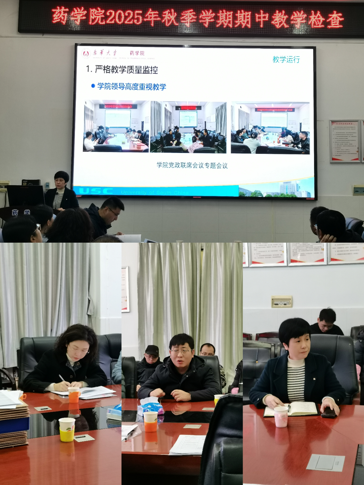 2025年11月20日上午8时30分,南华大学教务部副部长周洲率校教学督导团专家杨胜园教授等一行,莅临药学院开展期中教学检查工作。检查汇报会在药学楼B101会议室举行,药学院院长王震、副院长易岚、各教研室及实验中心主任、教务办老师及教师代表共同参会。