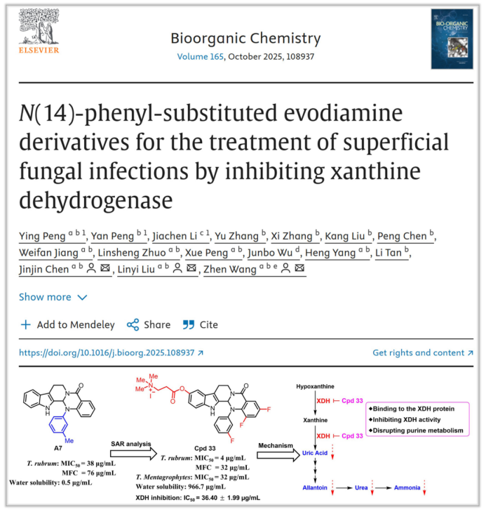 彭颖博士所在王震教授团队,前期研究发现吴茱萸碱14位N引入苯基后,其抗真菌活性与代谢稳定性均实现显著提升,进而筛选出具有良好体内外抗真菌活性和安全性的化合物A7,优于一线抗真菌药物酮康唑(Bioorg. Chem., 2022, 127:105981)。为进一步提升成药性,本研究采用“水溶性基团引入”策略,同步优化其溶解性与活性。团队构建了>100个吴茱萸碱衍生物库,通过深入构效关系分析,得到了溶解性良好、抗真菌强的化合物33。体内外活性研究表明,化合物33可高效的抑制孢子萌发、破坏真菌菌丝、杀灭真菌,进而显著抑制豚鼠皮癣感染,治疗效果优于阳性对照药物酮康唑。此外,化合物33不易诱导真菌产生耐药性,对酮康唑耐药菌株仍能保持稳定活性。机制研究揭示出化合物33通过结合并抑制真菌嘌呤代谢关键限速酶——黄嘌呤脱氢酶(xanthine dehydrogenase,XDH),干扰真菌嘌呤代谢,造成真菌死亡,进而发挥高效杀真菌活性。