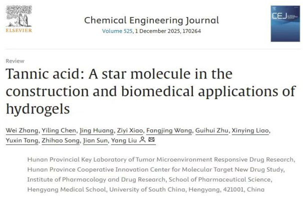 近日,南华大学传来喜讯。药学院2025届药学拔尖班学生张薇以第一作者身份完成的综述论文《Tannic acid: A star molecule in the construction and biomedical applications of hydrogels》成功在国际知名期刊《Chemical Engineering Journal》(中科院一区TOP,IF=13.2)发表,药学院刘阳老师为通讯作者,药学院为唯一单位。这是我校本科生在生物医药材料领域高水平学术成果产出的又一重要突破。