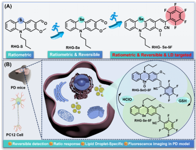 帕金森病作为一种典型的神经退行性疾病,其发生发展与氧化应激增强及脂质代谢紊乱密切相关。脂滴作为细胞内脂质代谢与储存的关键细胞器,其在帕金森病,尤其是在铁死亡过程中所呈现的氧化还原动态变化仍缺乏系统认识。对脂滴内氧化还原稳态(如HClO/GSH氧化还原对)进行实时、原位监测,对于深入揭示帕金森病的病理机制具有重要意义。然而,现有荧光探针普遍存在响应不可逆、亚细胞靶向性不足或非比率型设计等局限,难以在复杂生物体系中实现对脂滴内氧化还原状态的动态、精准监测。