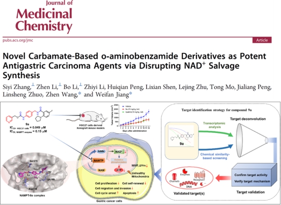 代谢重编程是恶性肿瘤的重要特征之一,其中烟酰胺腺嘌呤二核苷酸(NAD⁺)作为能量代谢和多种细胞生存通路的核心辅酶,在肿瘤发生发展中发挥关键作用。烟酰胺磷酸核糖转移酶(NAMPT)是NAD⁺挽救合成途径的限速酶,在胃癌中普遍高表达,被认为是具有潜力的抗肿瘤治疗靶点。近年来,雷竞技中国 江伟凡博士所在王震教授团队围绕NAMPT靶向抗胃癌小分子药物开展了系统研究,并在国际药物化学权威期刊Journal of Medicinal Chemistry上连续发表研究成果,逐步推动相关研究由靶点发现向高效、安全、可转化候选分子迈进。在2025年6月发表的研究工作中(https://doi.org/10.1021/acs.jmedchem.4c02686),团队以前期发现的邻氨基苯甲酰胺类化合物F8为先导,通过结构修饰获得化合物9a。研究首次从分子和代谢层面明确9a为一种NAMPT抑制剂,可通过降低肿瘤细胞内NAD⁺和ATP水平,抑制未分化型胃癌细胞的增殖、迁移和克隆形成。该研究完成了NAMPT作为抗胃癌有效靶点的确证,为后续结构优化奠定了坚实基础。