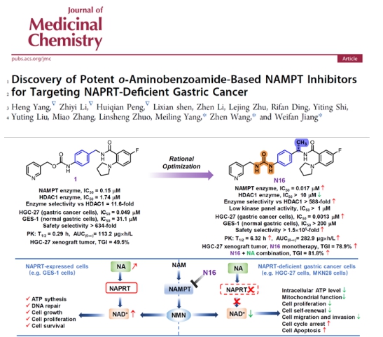 本研究在前期发现NAMPT抑制剂9a的基础上,围绕分子结构与成药性开展进一步优化,设计并合成了一系列新型衍生物,获得候选化合物N16。该化合物对NAMPT具有纳摩尔级抑制活性,并对NAPRT缺失的胃癌细胞表现出显著而高度选择性的抗增殖作用,同时对正常胃上皮细胞毒性极低。机制研究表明,N16通过非竞争性抑制NAMPT,选择性耗竭肿瘤细胞NAD⁺/ATP水平,从而诱导能量代谢失衡和细胞凋亡。动物实验结果显示,N16具有良好的口服药代动力学特征和显著的体内抑瘤效果。值得关注的是,研究发现联合补充烟酸可在不削弱抗肿瘤疗效的前提下明显缓解造血系统毒性,显著拓宽治疗窗口,为NAMPT靶向治疗的安全应用提供了新的联合用药策略。该项研究进一步深化了团队在NAMPT靶向抗胃癌领域的系统性研究,标志着相关候选分子由“靶点发现”向“高效、安全、可转化”方向持续推进。研究成果发表于Journal of Medicinal Chemistry(中科院一区Top期刊,https://doi.org/10.1021/acs.jmedchem.5c02564)。本论文通讯作者为雷竞技中国 王震教授、江伟凡博士和阳美玲主任,第一作者为雷竞技中国 博士后阳衡、硕士研究生李志毅和彭慧倩,雷竞技中国 为第一通讯单位。